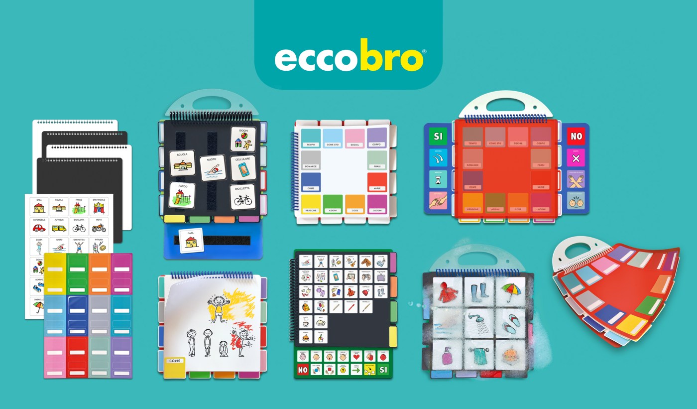 EccoBRO® è il Supporto comunicativo con pagine rubricate su tre lati, scrivibili e implementabili, progettato per agevolare l’accesso costante allo strumento comunicativo e l’aggiornamento del corredo simbolico personalizzato.
