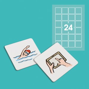 50 tessere bianche 5x5cm in PP bianco opaco, con angoli arrotondati e bollini in velcroø 1cm; 3 fogli A4 di etichette adesive 40x40mm (cod. BRA-8) per la stampa di simboli adesivi lavabili personalizzati.